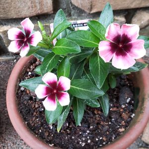 昨年お迎えした 北島園芸さんの ニチニチソウ メルモちゃん💖 かわいくって 冬越しさせちゃいました🥰 咲いてくれました❣️嬉しいな🤗 花色が少しマーブルになってて、さらに可愛いです💕