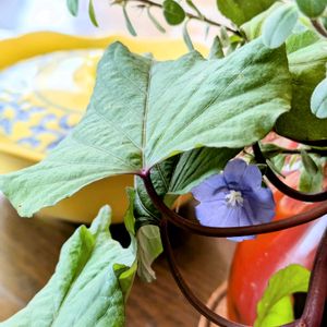 こんにちは(*^^*) 昨日の安寧芋からの〜〜〜 今日もサツマイモ〜〜🍠の、枝葉🌿 某お店のママさんから、飾るのに良いわよ〜と、伸びたサツマイモの枝葉をいただきました。 剪定したアメリカンブルーのお花が、その葉っぱの下で咲いてくれて、 なんか絵になる‼️と、パチリ📱です♬ アメリカンブルー、花瓶の中で全部根っこが伸びました。 このままお手入れしながら行くと、冬越し出来る?