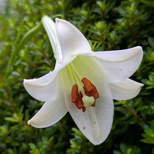 おはようございます(*^^*) 一番花でございます♬ 今朝はお湿り程度の雨が降りました。 涼しくなるかと思いきや、湿気が多くて逆に蒸し暑い💧 ユリですが、最初の頃はくっきり筋が入った、正に[タカサゴユリ]だったのですが、去年辺りから筋なしの娘が咲きます。 変異が有るとの解説どおりだなぁと、不思議な気持ちで眺めました。 不思議だけど、朝イチでこの姿を見られて、清々しい気持ちになりました(*^^)v