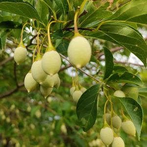 ピンクの花が咲くエゴの木の実ができました⚪️ 六月の桜🌸の別名の美しい花が、卵の様な実 花畑の道端で大きく育ち、まるで卵の木です