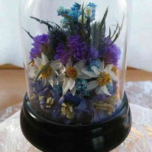 ドームにアレンジ~💕 下から デルフィニウム、ペーパーカスケード、スターチス 、エリンジウム、カスミソウで爽やか系に……(’-’*)♪