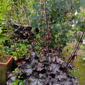 ヒューケラのお花が何本も出て解りずらいですが白い花が咲いてます 😍 葉っぱが綺麗です。👍️ うしろはユーカリ です この子は初めて挑戦 、 葉が落ちてたのを拾い潰し、匂いを嗅ぐと、とても良い香りがしました 初めて、苗を購入 葉をドライにしてみたくて! 良い案があれば 教えて下さい! 宜しくお願いします🙇⤵️