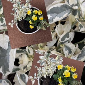 こちらは初雪*❄️ ̖́- 寄せ植え達は昨夕軒下に避難させました。 多肉さんは室内に❣️ 写真の未完成な寄せ植え😅 一昨日、色々お花やリーフ買いましたがこのふたつ残ってしまいました。 昨日の暖かそうな寄せ植えにはこのレモン色🍋は合わなかった💦 とりあえずこのふたつは一緒に植えてもOKかな❣️ 空いてるところに植えるの何がいいかな〜年内にお花屋さんに行くけれど更に他にも持ってきてしまいそう😓 キリがありませんね😅