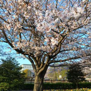 ワンコの散歩🐾でよく行く公園 まだ桜が咲いています。 桜の下には町のお花スイセンが満開🌱
