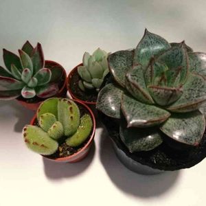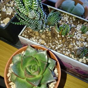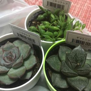母の多肉たちー! 🌱大きい黒めのものがヤマトニシキ 🌱その右隣のツンツンしているのがスノージェイド 🌱左下の大きいものがマッコス お母さん雑だからラベルなくて小さいちょこちょこしてるのはわからなかったー😭