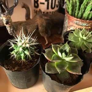 近所の新潟の100均なんじゃ村から連れてきた子達🌵🌱 今月半ばから今月はもう我慢だと決めてきたけど、この店で3回目の買い物時、毎回見てはやめてたけど、我慢できず😅💦 乾燥させ終わったので植えました🌵🌱✨ 皆さんの投稿見てたらサボテンも欲しくなり( *´艸`)🎶🎶 10年位前に友達にもらったイラストサボテンだったなと、 一緒に撮りたいとパチリ📷