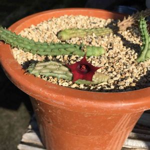 キモ可愛いやつ咲きましたー👍😁 フェルニアのゼブリナ錦✨ 1部斑入りじゃないけど…😅 あーもぅ〜、咲く時は言ってよー‼️ あやうく見逃してしまうところでした💦 このインパクトある花😂 香りは無い…と、思います! ホヤと同じガガイモ科とは思えん😑 近寄ると噛みつかれます(嘘)