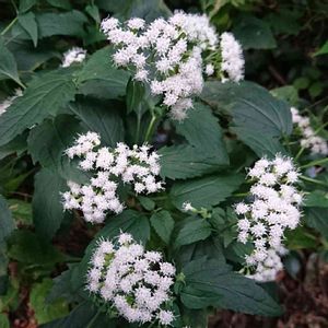 こんばんは(*^_^*) 今日、お墓参りの帰りに見つけたのですが このお花、GS始めたばかりの頃に 我が家の裏で咲いていた雑草と同じ。 あの時も”名前を教えて”で 投稿させて頂いたのですが、 分からずじまいでした…>_<… このpicから、どなたかお分かりになりますか? ・*:..。o○☼*゚・*:..。o○☼*゚・*:..。o○☼*゚ @かゆさんから回答を頂きました❣️ マルバフジバカマだそうです! マルバフジバカマ(丸葉藤袴、学名:Ageratina altissima)は、北アメリカ原産のキク科アゲラティナ属の多年生植物。 やや大型の多年草で、太く長い根茎がある。茎は単独または複数の茎がまとまって伸び、直立または斜上して高さ1.5メートルほどになる。葉は縁に鋸歯のある卵型。表面にはややつやがあり濃緑色[1]。晩夏から秋にかけて白い頭状花序の花を多数つける。頭花は20個ほどの筒状花から構成され、舌状花はない。花蜜は多種のチョウやガやハチを誘引する[2]。花後に白い綿毛の付いた小さな種子が風によって分散される。この種は湿った場所からやや乾いた場所まで広い環境に適応でき、裸地のあるような開放的な日陰にも生息するため、生け垣や薮陰の雑草にもなる。 この種はトリメトル(英語版) (tremetol) という有毒成分を含み、家畜がこの植物を食べると肉や牛乳に有毒成分が混入し、それらを食べたヒトも有毒成分を摂取することになる。そこで、このような汚染された肉や牛乳を食べつづけると、人間にもトリメトルによる中毒症状が発生する[12]。この中毒はミルク病(Milk Sickness)と呼ばれていた。 主に花を鑑賞用として栽培するが、近年では「ユーパトリウム'チョコラータ'」の名で銅葉の栽培品種が流通している。 (Wikipediaより)