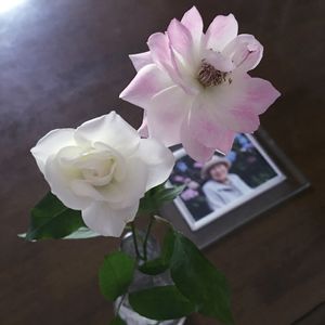 H28.10.10 3日前に亡くなった祖母を弔うように、ピンクのはずのバラが、この一輪だけが白く咲きました。 バラってすごい空気読むのね。 ちなみに右のバラは数日前切ってきたもので、祖母が亡くなってから初めて咲いた1発目が真っ白だったので、すごいなーと。 そして普段は右のバラと同じかそれよりも発色のいいピンクのバラなのに、見事に後にも先にもこれだけが。 何かを感じずにはいられない!!
