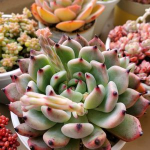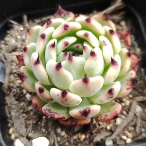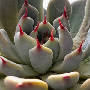 エケベリア・黒爪ザラゴーサさん😻🤍❤️ って黒爪…😺………❓ 室内で育成してたら 赤爪💅さんに変化してました😸 実際の ブラットザラゴーサ(赤爪ザラゴーサ/赤爪ザラゴサエ)さんは もっと爪が短くて細いです😸 育成環境での変化なのか 実生などで別物が混じってるのか…外で育成して変化を魅たいような…このままでも良い様な…悩〜〜〜む…😸💧💧