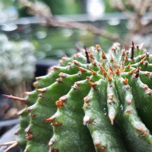 まだ花芽を見ないホリダ様 黒いトゲが渋い❗ 久しぶりの強い雨に打たれ 気持ち良さそう😊