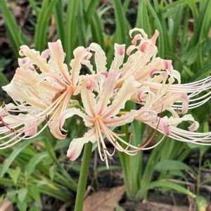 久しぶりにシロバナの彼岸花と出会いました。 一般的にシロバナマンジュシャゲ(白花曼珠沙華)、或いはシロバナヒガンバナ(白花彼岸花)と呼ばれ、黄色いショウキズイセン(鍾馗水仙』と紅色のヒガンバナ(彼岸花)との自然雑種だと云われています。 日本では九州南部を中心とした地域で自生が見られます。 花色は白地にピンクや黄色の筋が入り純白にはなりません。 花姿はヒガンバナに似ていますがヒガンバナと比べるとシロバナヒガンバナの方が、花びらの反り返りや縁のフリルが緩やかです。 『タグ太陽がくれた季節a』 『🏷️白輝美人』 『🏷️今日のお花』 『🏷️今日の一枚』 『🏷️今日の花』