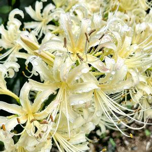 雨上がりの白花ヒガンバナ🤍💚🤍 お隣の畑で美しく咲いてます✨
