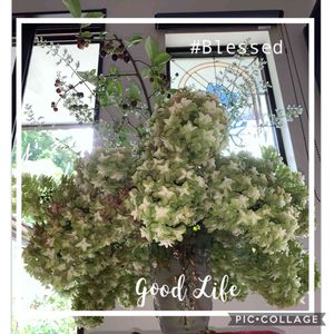 カットした柏葉紫陽花と、カラミンサ✂️ 一本だけ誰かに折られたブルーベリー🟣 もったいないのでとりあえず 花瓶へ🌸 頭が重くて💧 バランスよく入れないと 倒れます😅 飾りきれなくて、残りは ゴメンなさい🙏