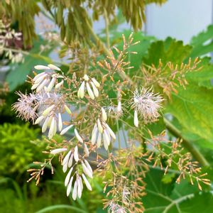 タケニグサ。2年位前に椿を買って鉢に植えたらいつの間にか一緒に成長していて(多分ポットに種がはいりこんでいた?)、葉っぱが可愛らしかったので地植えしてみたら、160センチ位にしかも二株に増えていました😅 お花が咲きかけています。 これ以上増殖、せいたかのっぽになったらどうしましょう😥