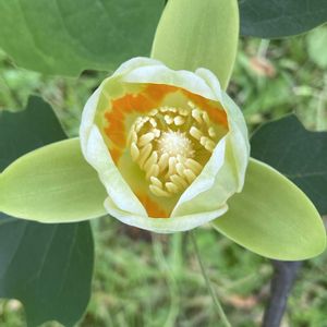ユリノキの花 すぐそばのメタセコイアの木と 高さを競い合うような高木ですが ここでは地表スレスレまで 枝を伸ばしています。 この花を上から見ることなんて あまりないかも? ホオノキやタイサンボクと同じモクレン科の花というのも花のつくりを見れば納得。 また学名tulipiferaはチューリップ(のような花をつける)の意味というのも、横から見れば確かにそう。