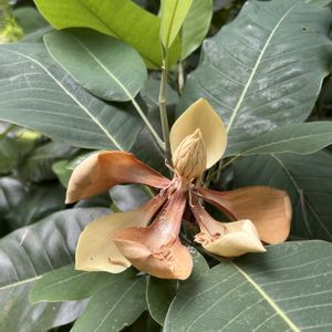 小石川植物園の散策 6/4 🤍山玉蘭(サンギョクラン)🤍 モクレン科モクレン属 常緑高木 開花期5〜6月 夕暮れと共に咲き始めるお花なので花後しか見れない 6/1.6/4と残念ながら花殻のみでした 葉脈が美しい大きな葉、でもお花見たいです 慌てて年パス忘れたテヘ🥲