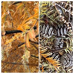 「メタセコイヤ🌿」 葉っぱが 少し色づき始めていました。 足元には 実が、 ごろごろと落ちてよく見ると可愛いらしい。😉