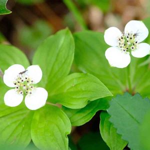 ゴゼンタチバナ 高山の針葉樹林の中に育つ日陰の花💠 6枚葉にハナミズキ・ヤマボウシに似た花が咲く。 高さは5〜15cm位。小遠見山⛰登山道脇で会う😄