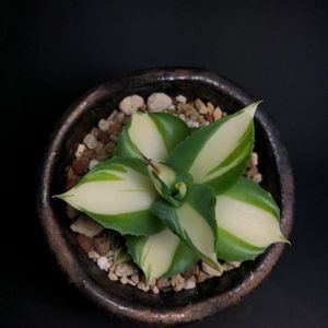Agave isthmensis ‘Ohi Raijin’ アガベ 王妃雷神白中斑から出た子株です。 黄中斑とゆうやつですかね。 親株からもぎ取って単体で育てていくことにしました😊 わりとガッツリ目に斑が入っているのでこのまま大きくなればかなり綺麗になると思います。 生育中に白中斑に戻ることもあるのだろうか。