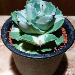 初アガベ✨ 鉢とのバランスが素敵でお迎えしました。 種類を教えてもらったところ『王妃雷神錦』などという、めちゃくちゃカッコイイ名前で、ちょっと見る目が変わりました👀