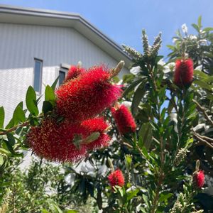 ブラシノキの花が満開\(*ˊᗜˋ*)/ 剪定してないからか花の数が年々増えてる気がするയꕤ
