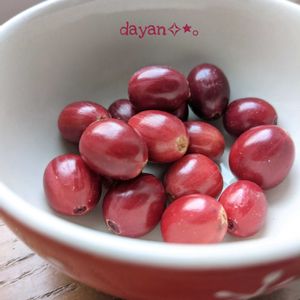 コーヒーチェリー収穫しました☕ 赤くてツヤツヤです😊🔴✨ 赤い果肉はほんのり甘く、中には殻に入った豆が2個入ってます その殻を割ると生豆が出てくるので、それを焙煎して挽くのです 一杯のコーヒーには60粒程必要みたい 小さい豆ならもっと要りますね😅 今年はこの量しか採れなくて一杯にも満たなかったです…残念😆💧