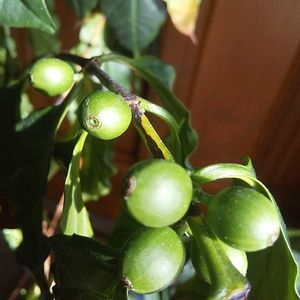 庭で鉢植えのコーヒーに緑の実ができてきました。