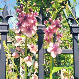 バーバスカム サザンチャーム💕 宿根草で、デルフィニウムと相性がいいと 聞いて、初めて育てています。 一株ですが、たくさん花芽がつきました。 となりには、ピンクたんぽぽ💕