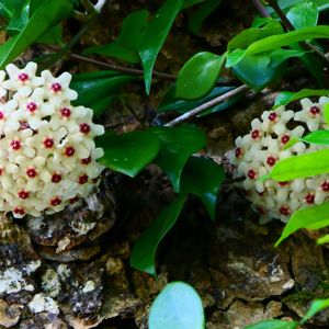 大岩の上に自生のサクララン(ホヤ)。光が差さないので花座はありません。 雑木林には自生蘭やサクラランをよく見かけます。自生らんのほうは、薄暗くても割りと花芽が着きます。