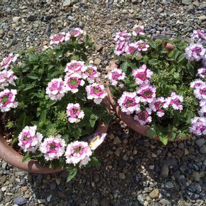 プランター花第3段‼️ 今までに見た事のない配色のバーベナちゃん❣️ 1鉢に1株しか植えてないのに、見事に広がり、沢山の花芽がつきました。 さぁ、どんどん咲いて楽しませてね〜💖