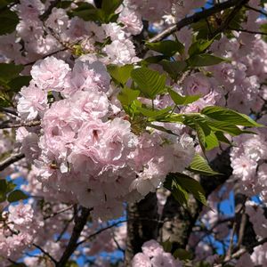 こんにちは😊✋ 今日の昼下がり ウォーキング🚶♀️で 出会ったお花🌼 サトザクラ🌸🩷 少しずつ 咲き始めました🤗 コロンとした 優しいピンク色の サトザクラ🌸 可愛いです🩷 今日は天気も良く 青空とさくらの色💙🩷 似合ってますね🤗