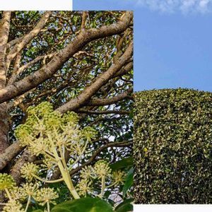 昨日のまあるい山に見えたのはこのキンモクセイですθ‿θ) → 表 ← 裏 隣りの敷地にまで成長したので🌿剪定してもらって太い幹がこんにちは~(◠‿・)—☆ヤツデさん*** 実家の庭 今日も充実した日にしていきましょ(人*´∀`)。*゚+☘️💕