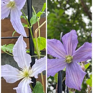 こちらの2種類のクレマチスの品種を 教えていただけたらと思います。 左側のクレマチスは薄紫です。 どちらかはプリンスチャールズでしょうか? 以前購入した覚えがあります😅
