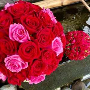 近所の神社の花手水舎 鮮やかな薔薇に変わっていました🌹