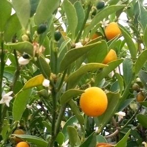 🏷️可愛い火曜日の花 🏷️花曜日✨ 🏷️あっ火曜日 キンカン 金柑 ①~④黄色い実 白いお花 babyの緑の実 同時に ⑤ 白いお花がかわいい 別のお宅