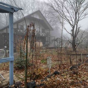 おはようございます。 今朝の自宅裏は水墨画の軽井沢です。