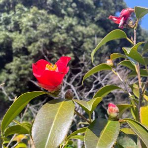 椿の赤い花 通り道へ渡る橋の側に 錦川沿いのお宅 昨日の仕事帰りに