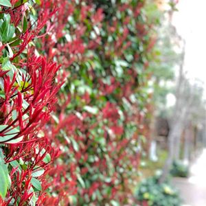 ベニカナメモチ(レットロビン) 日本産の🇯🇵カナメモチとアメリカ産🇺🇸のオオカナメモチがアメリカで掛け合わされてできた植物。 花言葉は「賑やか」 春になると赤い新芽が沢山出て賑やかな様子からついた花言葉です。 赤くキラキラでピカピカのレットロビンの生垣の散歩道は目も心も楽しませてもらえます。