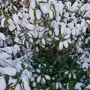 お昼過ぎ、🌞お天気が良くて かなり雪が解けてきましたけれど 垣根の🌱葉っぱに こんもりと綿雪が乗っかって まるで 白い花が咲いているようです。