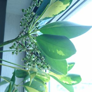 玄関のカポック(シェフレラ)にたくさんの実が付きました‼️ 初めてです💦 いつの間にお花が咲いたのだろう🤔 どんなお花か見逃したなぁ😩 天井近くだから気付かなかったわ😅 なんだかベトベトの水滴だらけなんだけど、触っても大丈夫❔ この実を植えたらカボックの芽が出るのか試して見よう😄❣️ 調べてみると、この粒の先のポチポチがお花ですって‼️ この後、この粒が黄色の実になるらしい❗ でも、この粒がポロポロ落ちてるから黄色い実まで残れるか心配だわ😨💦