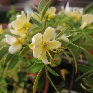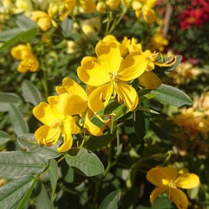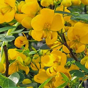 【ハナセンナ(アンデスの乙女・カッシア)】 アルゼンチン原産、マメ科の常緑低木 秋から初冬にかけて、枝先に黄色の5弁の花を房状に付ける。 マメ科特有の黄色い蝶のような花を咲かせる。 花径は3センチくらい。 夜になると、葉が閉じて眠りに入る。 樹高:2~3m 開花時期:9~11月 花色:黄色 JAグリーンコアやまぐち