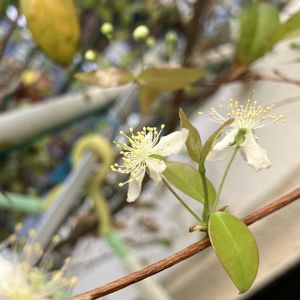 ベランダのひょろひょろピタンガ、花咲いた。 全体像がワサワサして見苦しいのは、グロリオサが絡まっているせいです。
