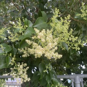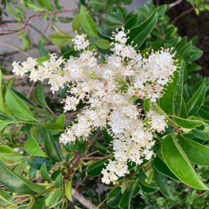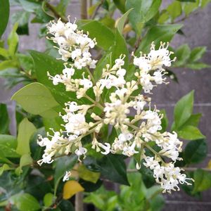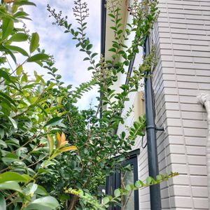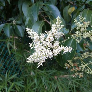 数年前 本榊としてお取り寄せ購入して 地植え 今年初めて花が咲きました でも……あれれ……花が違う💦 調べると_φ(・_・ ネズミモチ❀❀🍃らしい 素人には枝葉だけでは見分けがつかなかった🥲 2025.6-118
