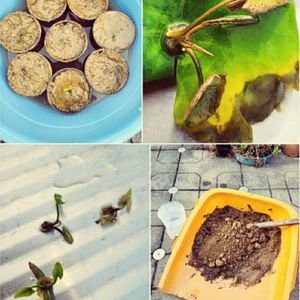 熱帯睡蓮 「イスラモラダの新芽の植込み」 右下(荒木田土の練り込み) 左下・右上 イスラモラダの新芽 左上 植込み後 イスラモラダはムカゴ種といい、ムカゴからも株分けが出来ます。 ハート型の葉っぱの茎の付け根にポッチがあったら、それがムカゴです。 葉っぱを切ってひっくりがえして水面に浮かべておきます。 3~4日経つと新芽が出て来ます。 葉っぱを切る時に、茎を3センチほど残して切ります。 左下よりも、右上のが植え込みやすいです。 右上の状態になったのを、ムカゴの周りを直径2~3センチに切って、残した茎を刺すように植え付けると楽です。 左下の形にしてしまうと、植付けが大変です。 植付け後の写メの上二つは、植え込みしていません。 下側6ポットを植付けしました。 荒木田土の練り込みは、小さな芽を扱うので、土の塊を極力少なくして柔らかくしてみました。 幾日で大きな葉っぱが出て来るでしょうか? 楽しみですね。