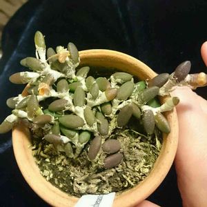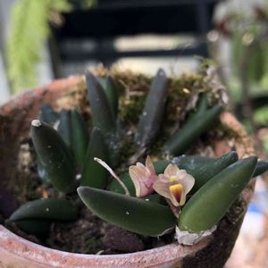デンドロビウム リケナストラム?リチェナストラム。 この子は色んな葉のタイプがあるとの事で愛らしさの虜になった私はちょっとコレクションしてみました。後列真ん中の小さい子が蘭展にて購入の子。長かったり丸っこかったり平たかったり。花は小さくて米粒みたいだけど、やっぱ葉っぱが可愛いってのは最強。 実家の父は日本の蘭を趣味として、お前は業者か!って位沢山育ててたので、子供の頃からの蘭のイメージが、かさ張ってオフシーズンにはただの草っぽくて邪魔だなーっだったのもあって💦 最近この小さめ肉厚の蘭の可愛さがとても新鮮です。 サボテンや多肉みたいに強い日差しを必要としないので、置き場的にも助かります。 しかも割りと丈夫らしいので、たまらんですねこの子😍 そしてグルグルコルクやサボテンの骨にくくりつけてます。 上手くいくかな~