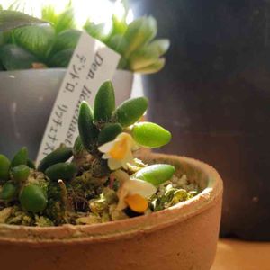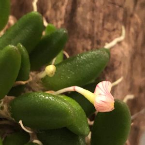 デンドロビウム リケナストラム Dendrobium lichenastrum (F.Muell.) Rolfe (1905) ラン科セッコク属(デンドロビウム属) オーストラリアはクイーンズランド州…ヨーク岬半島の北岸~北東岸の開放林や熱帯雨林に自生します。 1cm足らずの押し麦のような葉が連なるように匍匐する超小型のデンドロで、こういうの好きなんですが、昔、バルボと抱き合わせで買ったときは1年持たせられずに枯らせてしまったので、以来手を出さずにいました。 昨年2月のラン展のワンコインコーナーに置いてあって、『えっ、ワンコインでいいんですか?』と思って手に取ってから1年、何とか枯らさずに冬を越えたと思ったら花まで咲いてくれました。 まあ、1年目の花は売り主の手柄だと思っているので、来年以降咲くのかどうか、そもそも、以前はなぜ枯れて今回はなぜ大丈夫だったのか、そこも理解できてないので、来年まで生きてるかどうかも怪しいですが、とりあえず記念に。 あ、画像の花は同じ鉢の中なんですが、2輪入るように写すと花がすごく小さく写るのでトリミングしました。
