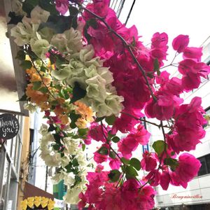 明るいピンク、白、そして珍しいオレンジ色🍊の ブーゲンビリアのカーテン(*˘◡˘*)•*¨*•.¸¸♪ オレンジ色が目を惹き つい撮らせてもらいました。 ピンク色を触ったら本物だったので全部リアルかな?😊 通勤途中のお花やさんにて。