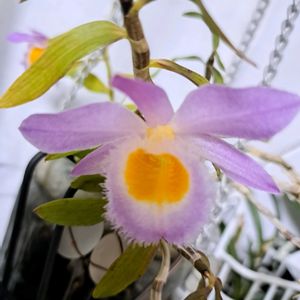 デンドロビウムロディゲシー 去年は花芽なしで😣でしたが、今年はたった2つでしたが咲きました。リップ中心の黄色、モケモケがかわいい💝