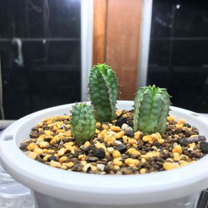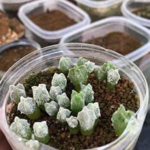 ユーフォルビア ホリダの実生です。 昨年の6月頃播種してそれらしくなってきました。種子20個のうち11発芽して6株残りました。